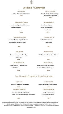 All prices are in Turkish Lira and inclusive of VAT. / This menu is included to the Ultra All Inclusive (UAI) concept.