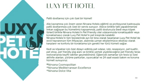 Nirvana Hotels’in tüm tesislerinde ayrı bir bina olarak tasarlanan Luxy Pet Hotel’de
