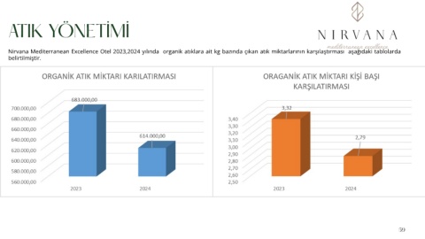 ATIK YÖNETİMİ Nirvana Mediterranean Excellence Otel 2023,2024 yılında organik atıklara ait kg bazında çıkan atık miktarlarının karşılaştırması aşağıdaki tablolarda belirtilmiştir. 59