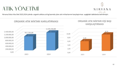 ATIK YÖNETİMİ Nirvana Dolce Vita Otel 2023,2024 yılında organik atıklara ait kg bazında çıkan atık miktarlarının karşılaştırması aşağıdaki tablolarda belirtilmiştir. 61