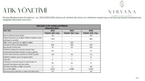 ATIK YÖNETİMİ Nirvana Mediterranean Excellence için, 2022,2023,2024 yıllarına ait, tehlikeli atık türleri için miktarların toplam kg ve kişi başı kg bazında karşılaştırması aşağıdaki tablolarda mevcuttur 64
