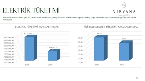 ELEKTRİK TÜKETİMİ Nirvana Cosmopolitan için, 2023 ve 2024 yıllarına ait, enerji tüketimi miktarlarının toplam ve kişi başı bazında karşılaştırması aşağıdaki tablolarda mevcuttur 69