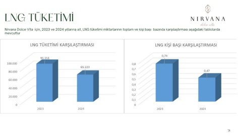 LNG TÜKETİMİ Nirvana Dolce Vita için, 2023 ve 2024 yıllarına ait, LNG tüketimi miktarlarının toplam ve kişi başı bazında karşılaştırması aşağıdaki tablolarda mevcuttur 6 6 71 2 2