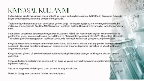 Kullandığımız tüm kimyasalların onaylı, etiketli ve uygun ambalajlarda olması, MSDS’lerin (Malzeme Güvenlik