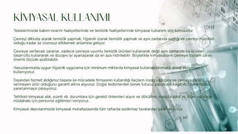 Tesislerimizde bakım-onarım faaliyetlerinde ve temizlik faaliyetlerinde kimyasal kullanımı söz konusudur.