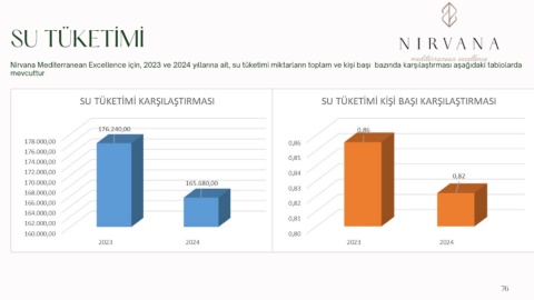 SU TÜKETİMİ Nirvana Mediterranean Excellence için, 2023 ve 2024 yıllarına ait, su tüketimi miktarların toplam ve kişi başı bazında karşılaştırması aşağıdaki tablolarda mevcuttur 76